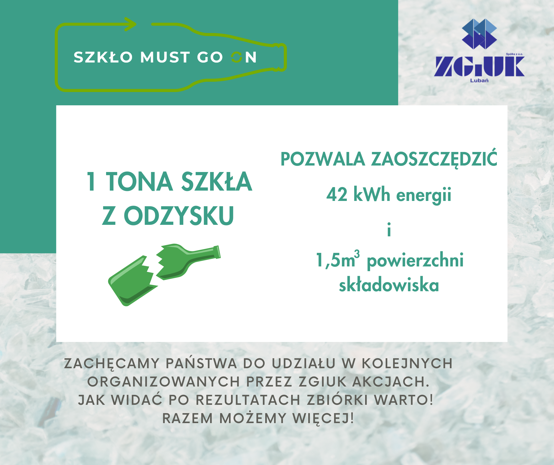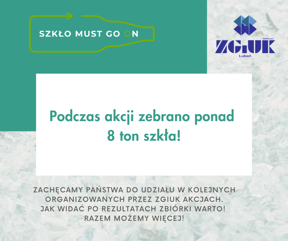 Za nami Wielka Zbiórka Szkła!!! Wspólnie z Rekopol Organizacja Odzysku Opakowań S.A. zorganizowaliśmy zbiórkę opakowań szklanych podczas której zebraliśmy rekordową ilość 8 ton 400 kilogramów szkła (butelki/słoiki)Oprócz możliwości oddania starych, niepotrzebnych opakowań szklanych i otrzymania wzamian sadzonki wrzosu lub szklanej butelki wielorazowego użytku czekało na nas wiele innych atrakcji m.in. koncert Wiktora Waligóry czy występ Pana Buźki. Na miejscu znajdowały się stoiska ZGIUK oraz Rekopol gdzie można było wziąć udział w licznych konkursach i zdobyć wspaniałe nagrody. Dzieci mogły spędzić czas na zabawie a następnie zjeść popcorn czy kolorwą watę cukrową. Każdy mieszkaniec miał również możliwość pooglądania sprzętów na których codziennie pracują pracownicy ZGIUK. Szczęściarzom udało się zobaczyć Lubań z nieco innej perspektywy tzn. z kosza podnośnika. Dziękujemy, że tak wiele osób zaangażowało się w nasz projekt. Wspólnie zebrane szkło opakowaniowe trafi na linię technologiczną ZGiUK, gdzie zostanie przygotowane do ponownego przetworzenia. Zapraszamy wszystkich do udziału w kolejnych naszych projektach.